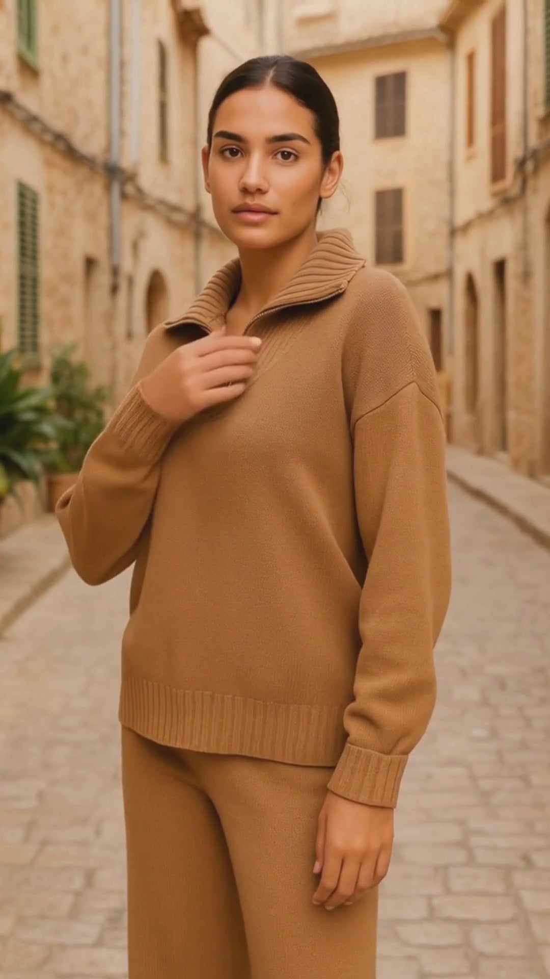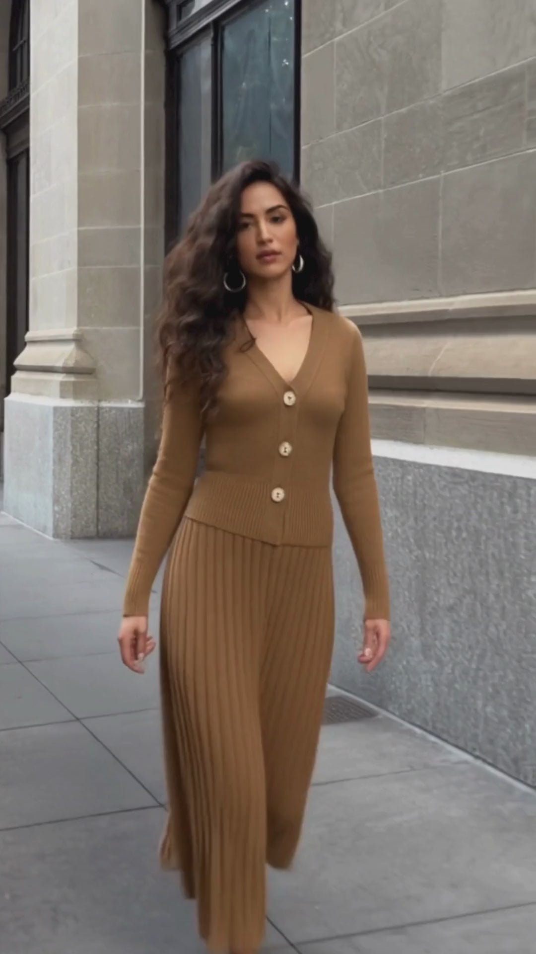 „Eleganz trifft Komfort – unser Strick-Zweiteiler in Beige oder Braun ist dein perfektes Herbst-Must-Have.“